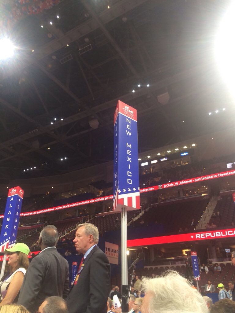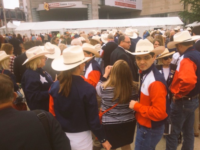 As our delegation gathered outside the main enterance of the convention for security screening, hundreds of Texans waited in line ahead of us. The many cowboy hats created a discussion among the New Mexico delegation members. Texans get sponsors for their broad-brimmed hats and shirts designed to resemble the Lone Star state’s flag.  Yes, you could say we were jealous.  Texas does do everything BIG!!